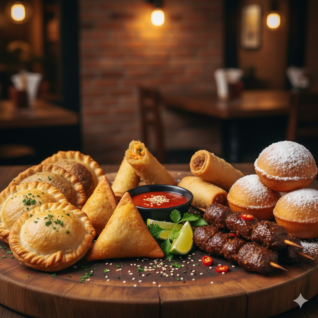 4 Chicken Pie | 4 Meat Pie | 4 Spring Roll | 4 Egg Roll | 6 Samosa | 10 Peppered Meat | 8 Puff-Puff